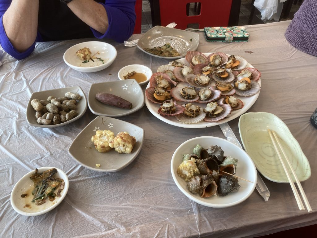 It was between breakfast and lunch, so pretty empty. We sat down and ordered scallops. What a veritable feast! Not only did we get twenty scallops (whole), we had cassava, an octopus kimchi pancake, winkles, sweetcorn and monkey nuts. Well some of us did.