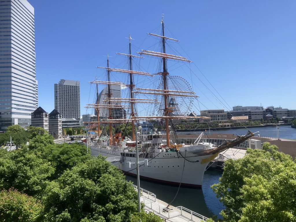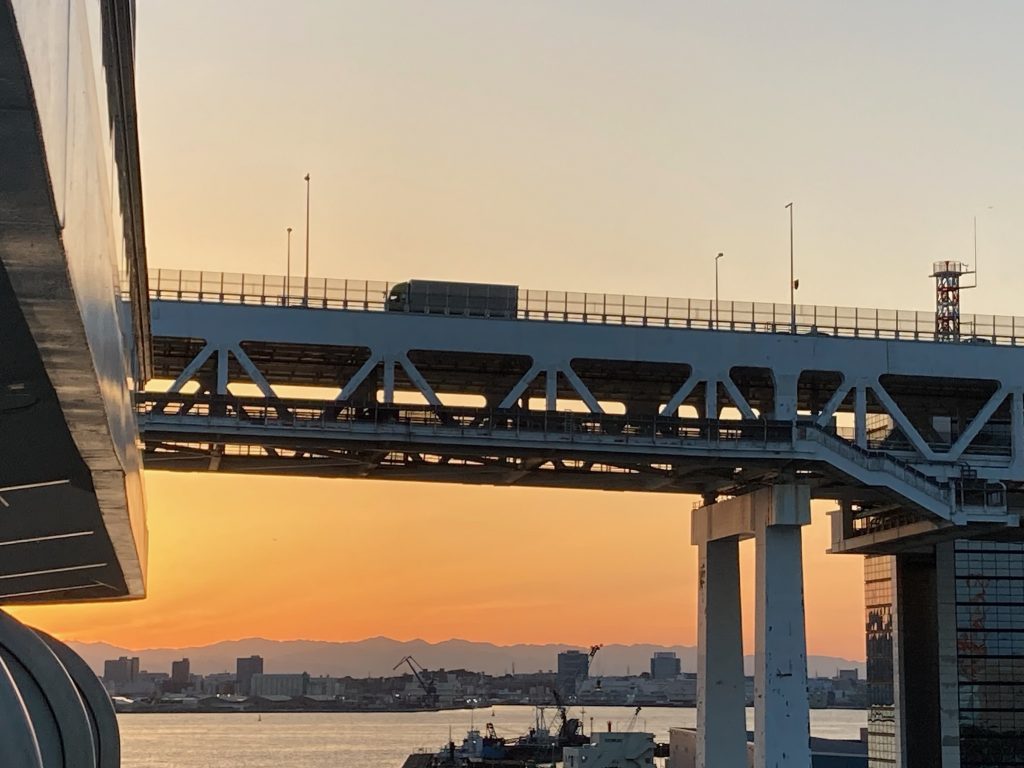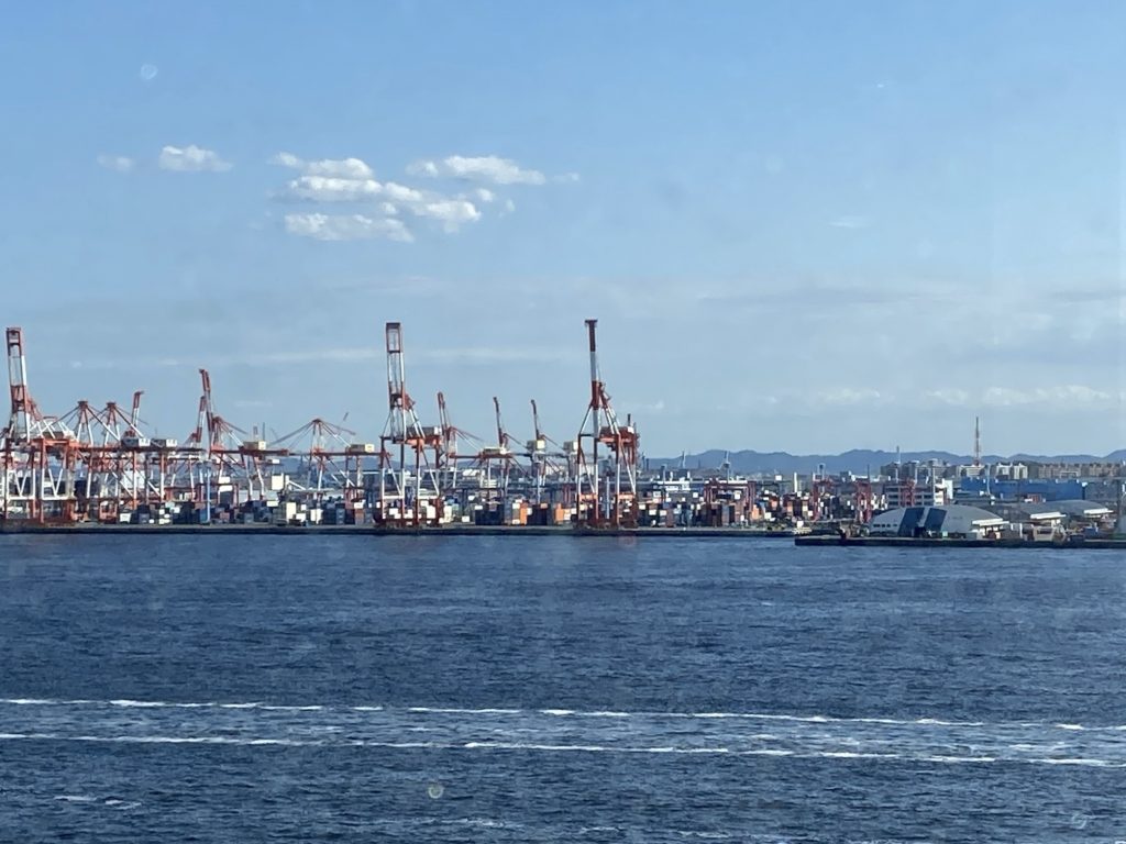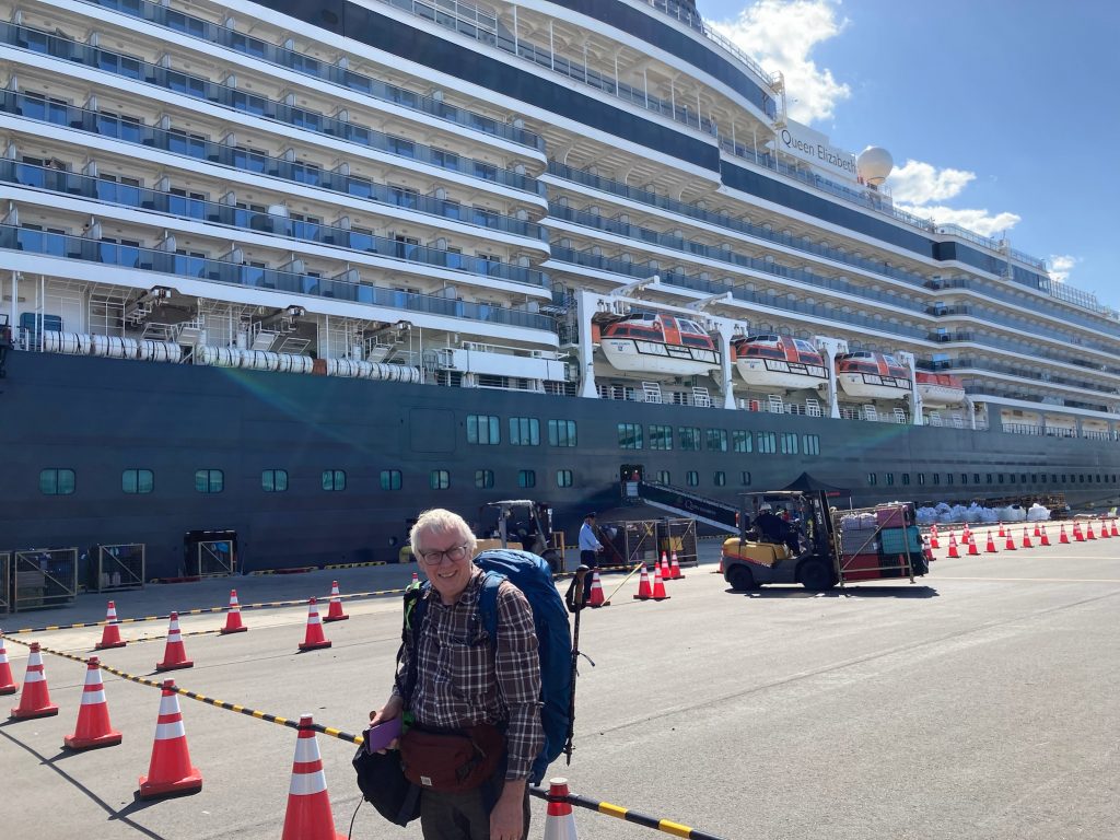 Embarkation day was gloriously sunny. We had arranged, with some difficulty, for a taxi to take us to the Yokohama’s Daikoku Pier to join our ship. We sped along the toll road, across an enormous bridge , alongside which the Queen Elizabeth was moored, and down the spaghetti junctions of roads. We were glad our driver knew where he was going and we alighted easily at the terminal.