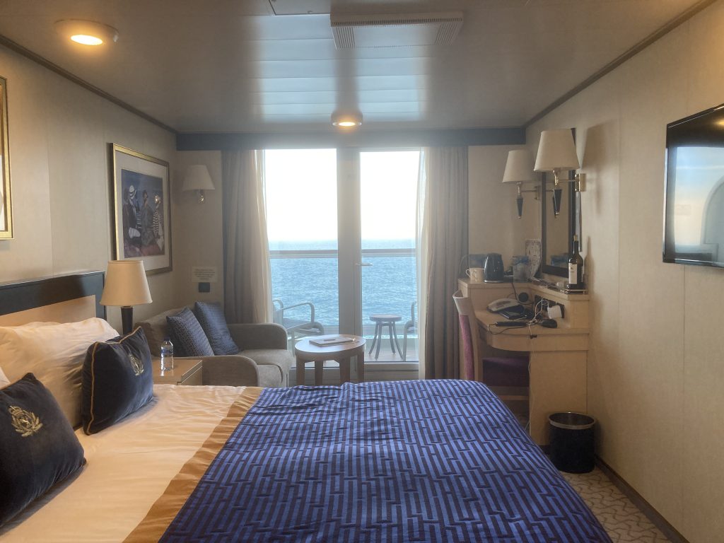 Our cabin (stateroom, they like to call it) was spacious and luxurious, with our own private balcony. We unpacked our rucksacks for the first time since leaving London – it seems so long ago.
