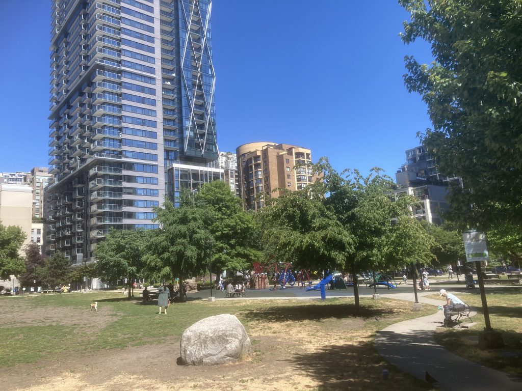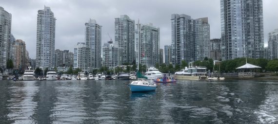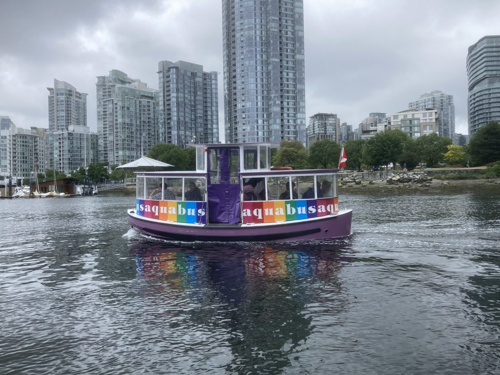 We wandered around the nearby Olympic Village, grabbing brunch before taking another water bus back, via Granville Island to Hornby Street. It was pleasant following False Creek, past the fabulous, extraordinary architecture of Vancouver, its noticeably young population (after the ship) and the activities on the water. From the sublime to the ridiculous – our water bus held twelve passengers, and the windows are removed in the summer!
