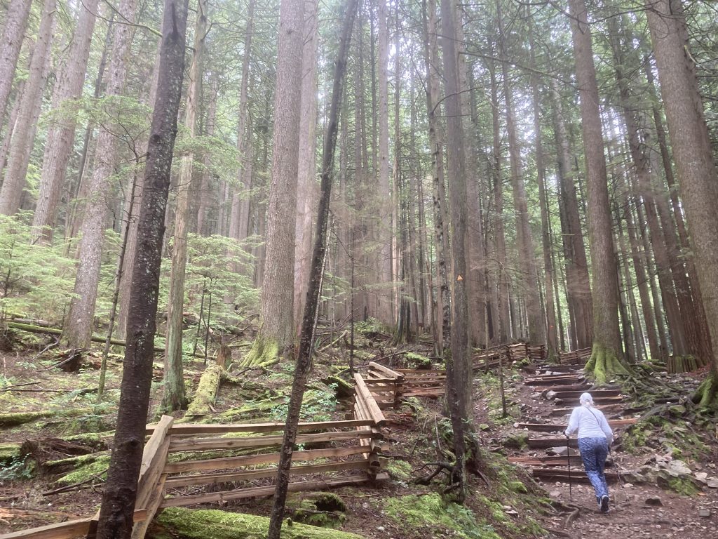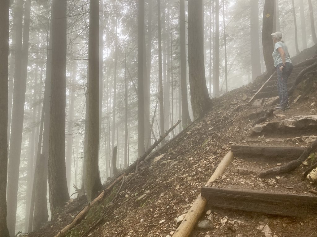We used the excellent public transportation system, the SkyTrain and two buses to get to the bottom of the trail and gondola, although it can be difficult to find the requisite bus stops. The weather was misty and cool as we climbed through the trees, but unbroken sunshine when we reached the top.