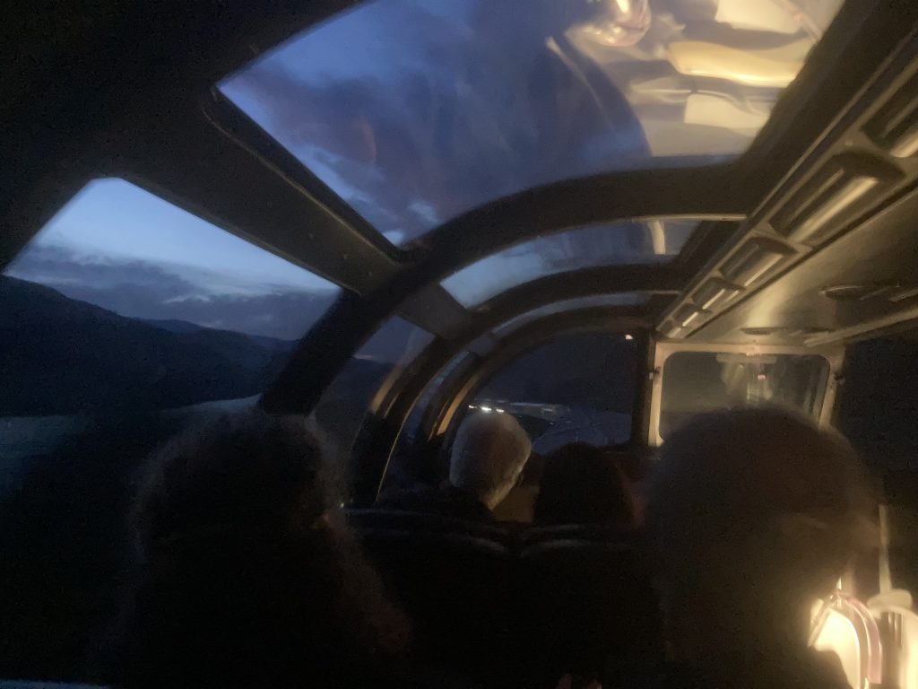 Our night-time berths were made up for us on our return from the restaurant car, with sumptuous mattresses and smooth, cool linen. Before turning in, we climbed up onto the viewing dome, above the train, to witness the darkening wild landscape, distantly illuminated by the locomotive searchlight.