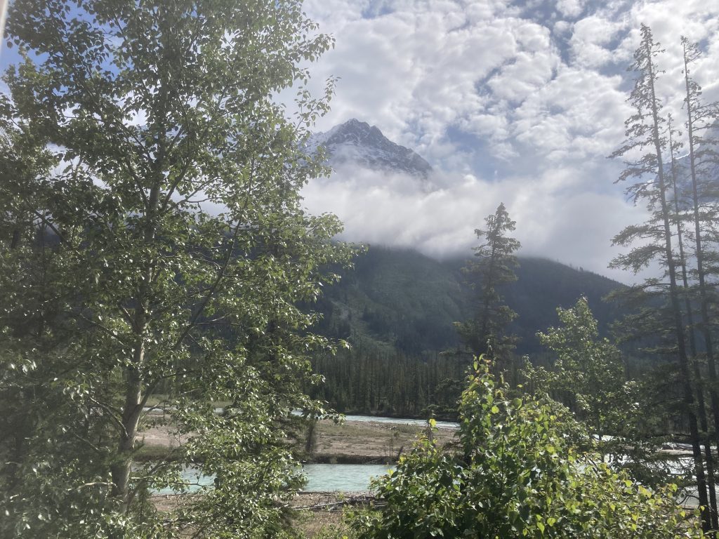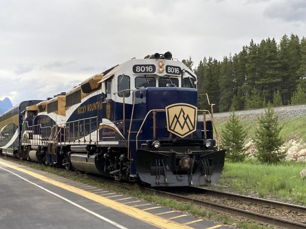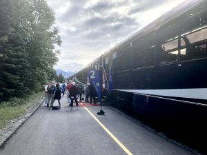 A cold morning, but with clearer sky than we had ever seen in Banff. We were waiting at our Banff hotel entrance for the Rocky Mountaineer bus to pick us up. We need not have worried- we were picked up on cue, bussed to Banff railway station to join the twelve carriage train.