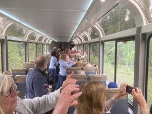 The train has two classes – Gold Leaf and Silver Leaf. Gold has two storey carriages, with observation seats on top and dining below, with an additional small open platform. Our carriage, Silver, was one level only, with dining at our seats, but the huge side and domed windows gave us fantastic views of the unfolding landscapes.
