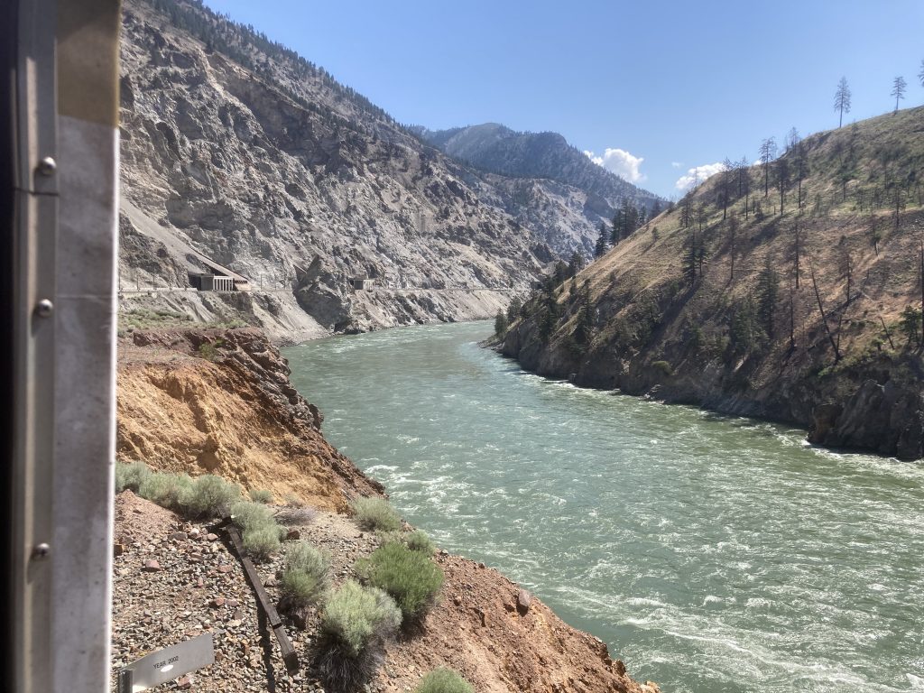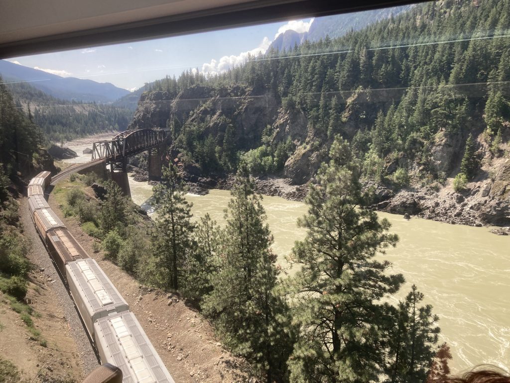 Our first day saw us complete 497km from Banff to Kamloops in 14 hours – not forgetting to adjust our watches to Pacific time. Train speed was mostly a modest 55 km per hour – partly to allow passengers to see and take photographs, partly due to track limitations. At times, we stopped on side tracks to allow enormously long freight trains to pass. Occasionally we speeded up to a maximum of 100 km per hour. Not often though!