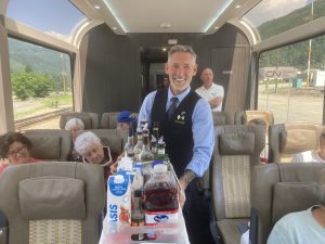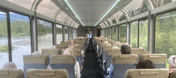 On boarding, there were large numbers of Rocky Mountaineer uniformed staff with clipboards and walkie talkies – all happy, smiley, cheery, waving and helping passengers to find their carriage and seats. Managed extremely professionally. This was not to be just a train journey – it was to be (quote:) ‘An experience of your lifetime’.