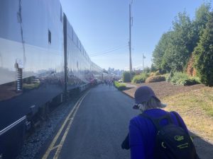 The landscape changed, softened and opened up. More roads were seen, some more buildings, fields, fertile land, the result of draining a lake, conurbations. Soon enough, we slowly trundled through the Vancouver suburbs, fresh, with new high-rises sprouting up, and SkyTrain tracks winding through.