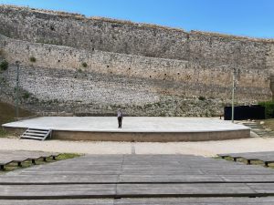 It was a delight to wander round the city, out of season. This meant that whilst some sights were closed, so were most of the tourist shops and restaurants, without hordes of tourists. We were astounded by the huge fortifications around the Old Town. Walking along the ramparts is possible during the summer, we were told, but we enjoyed the long walk in the (empty!) surrounding moat. The size and warlike intent was mind blowing. On the way, in the wide and deep moat, we found a theatre stage and circular seating, so Peter took the opportunity to declaim Shakespeare’s “Once more unto the breach, dear friends…”. A fitting speech for the location.