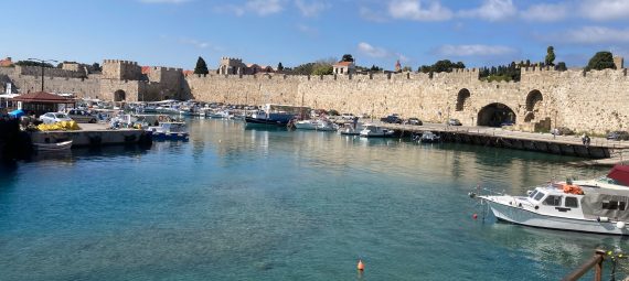 Our ship arrived in the Commercial Port in Rhodes on a lovely spring morning. The sun was glinting on the waves and the marina yacht sails were flapping in the stiff breeze – and we were determined to pick up breakfast en route to our hotel.