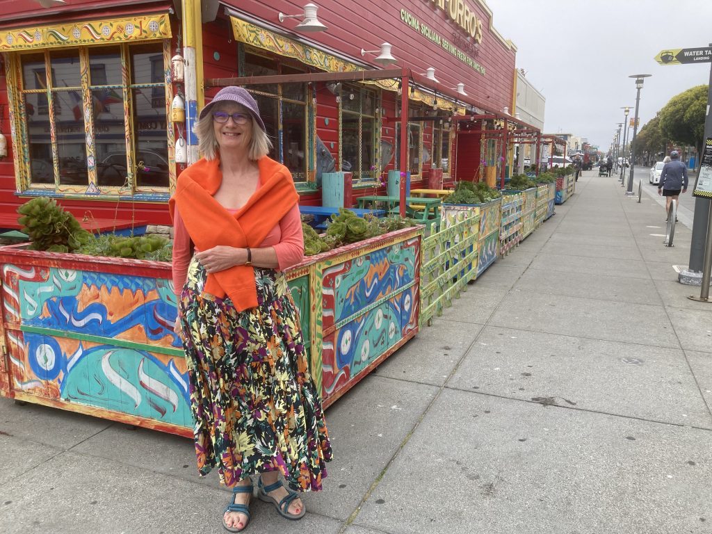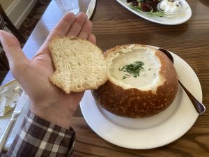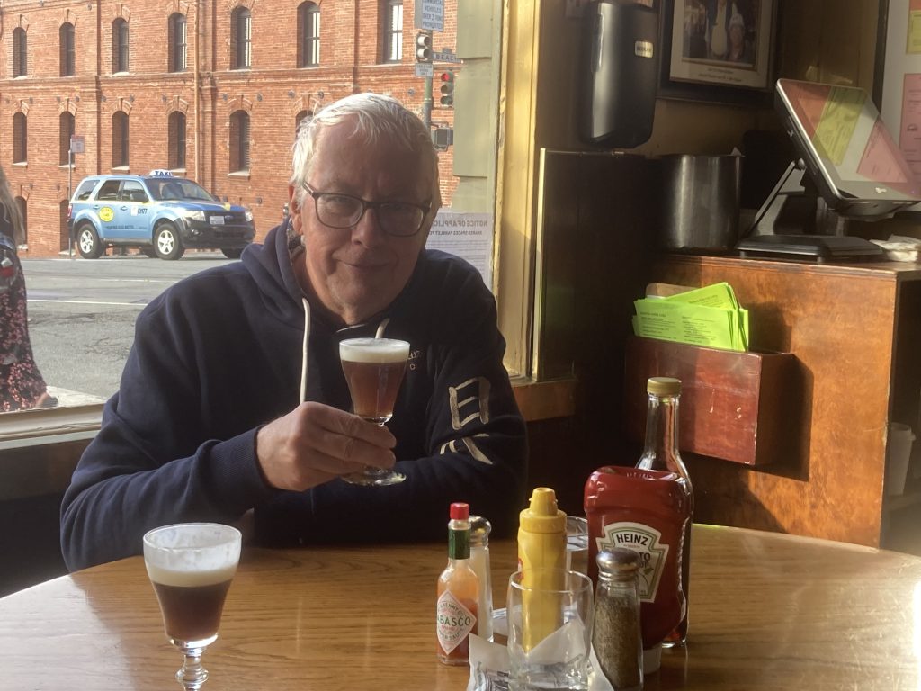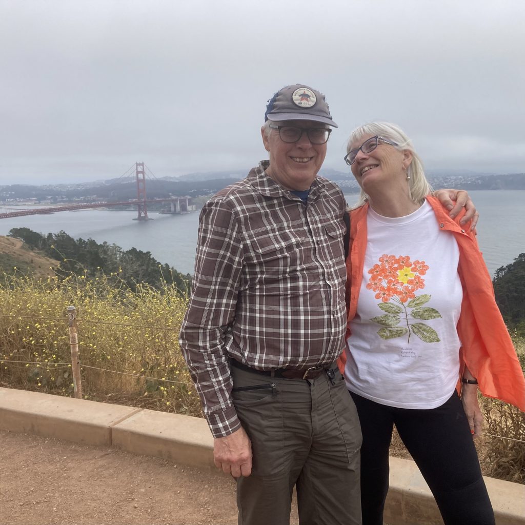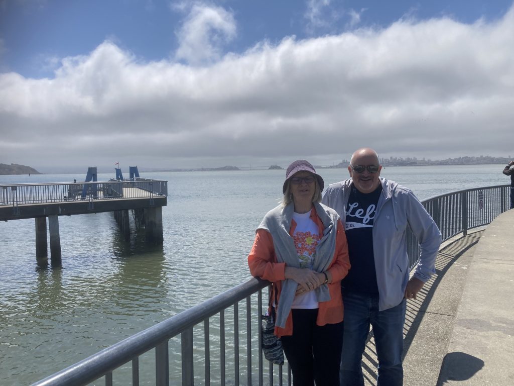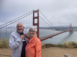 Passing time most agreeably, we drove to Sausalito, a beautiful marina community on the North side of the bay, walking alongside the arty shops and rows of yachts. A light lunch, with Peter having the local sea chowder served inside a loaf of bread, followed by a windswept visit to a magnificent viewpoint over the Golden Gate Bridge.