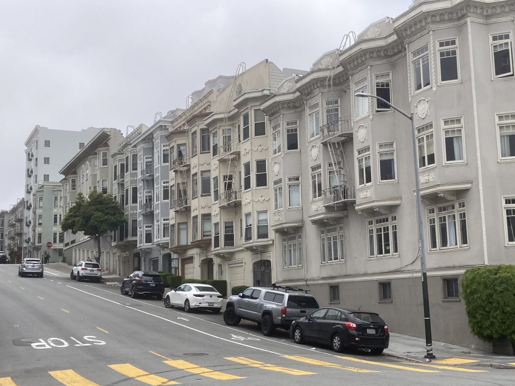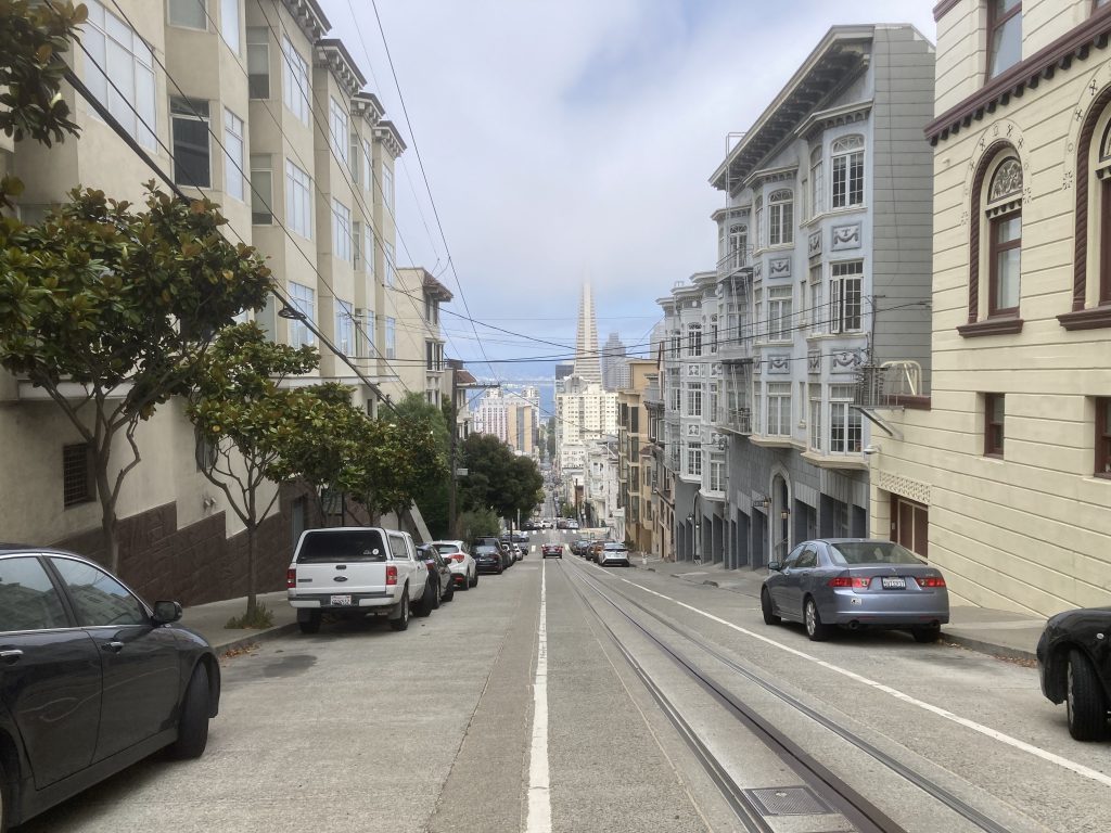 After a late breakfast in a diner, we enjoyed a long walk up (and we use that word advisedly) Polk Street to find a thrift shop and a heritage cable trolley. The two kilometre walk was a delight, among the quiet backstreets. The buildings were beautifully adorned, and were the quintessence of old-fashioned gracious style. The famous steep hill streets dogged our route.