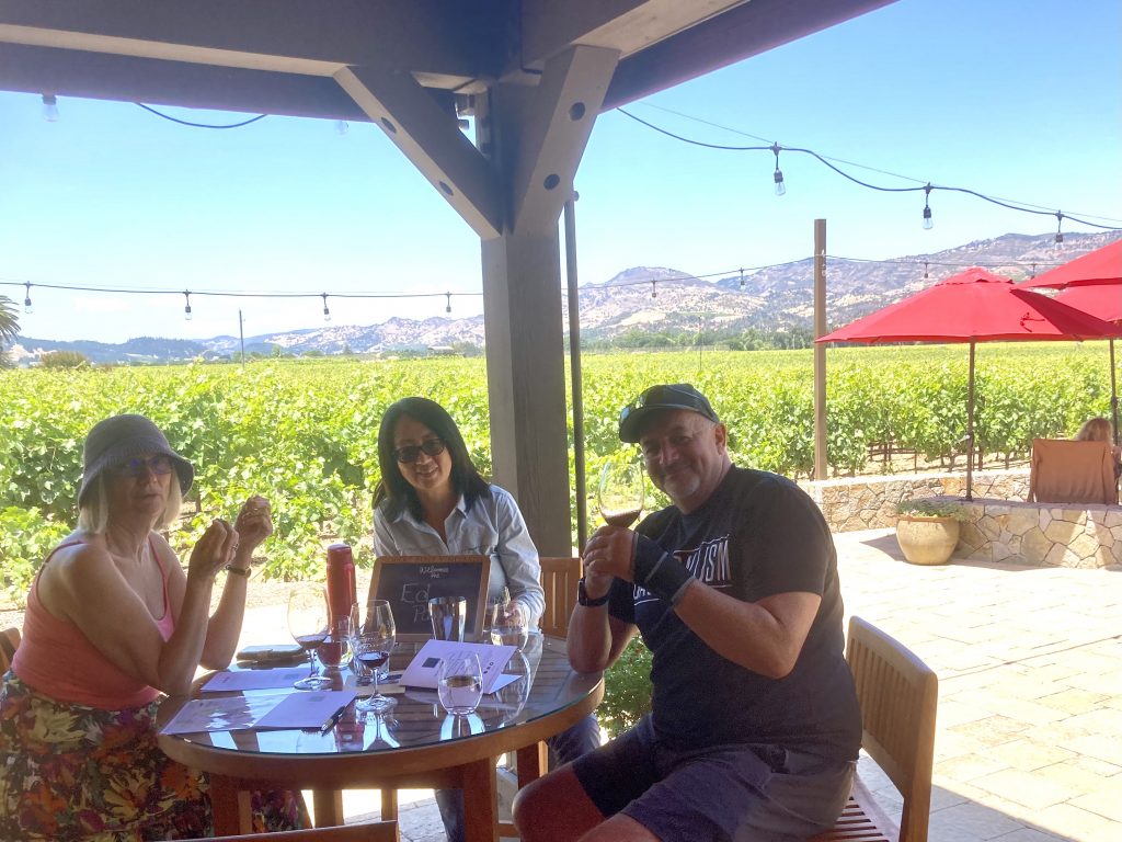 A new day, a new sunny outlook. Well, not so sunny – more cloudy and cold. Ten o’clock found ourselves, Lynne back on form, picked up by Gerry and Hua, setting the satnav to Napa! Crossing the Golden Gate Bridge again, the weather switched to sunny and warm. Microclimates around here are pretty extreme!
