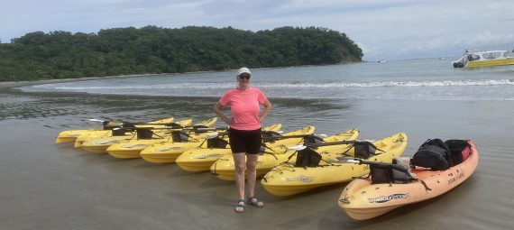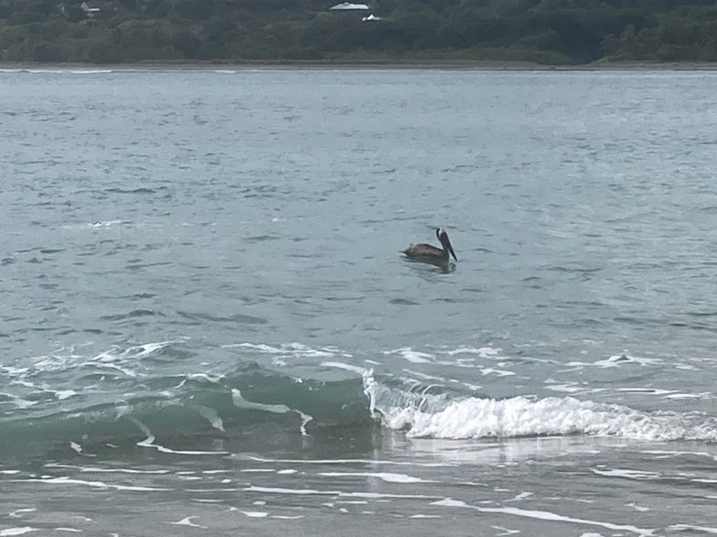 We had single kayaks, at Peter’s request, and paddled across the bay to an island, Isla Chora, about 1km out. It had a lovely coral sandy beach, home to hermit crabs, iguanas, buzzards, hawks, frigate birds and a brown pelican, who showed off his fishing skills. Even monkeys swim out to the island for a couple of weeks every year.