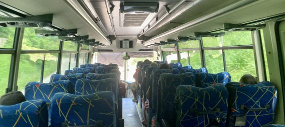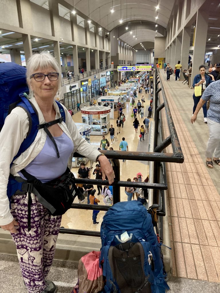 Our green bus, numbered 102, arrived late, but we were unperturbed as we’d seen all this before. We were on the case, and got our rucksacks stowed aboard the bus before the driver went for his lunch. He used the opportunity to give us the necessary customs forms to complete. Very promising, so far!