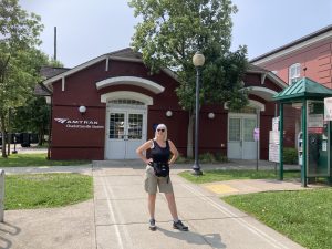 We briefly hopped out of the train at Charlottesville, just to send a photo to our friends, John and Mary who live there. It was only a five minute stop, with our sleeping car attendant warning us not to go far: – “Remember if you miss the train – you left the train, it didn’t leave you!”