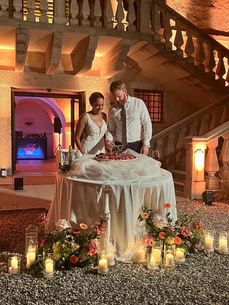 The legal marriage act was in Italian with an English translation. The speeches were given in one language with a written translation in the other language. The groom managed a bi-lingual speech. There were all sorts of exciting extras, hand-held paper fans, sparklers, a “drinking” game, temporary tattoos, a delicious wedding cake and a Hangover-Recovery kit to take away with us!