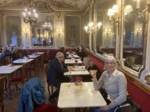 Across the busy road, we scouted the station to check where everything was, and that our home printed tickets were valid. A determination to celebrate the start of the journey led to us finding a charming patisserie, Caffe Platti, dating back to 1875, for a glass of bubbles and crisps. Though cold, Torino looked very rosy after that.